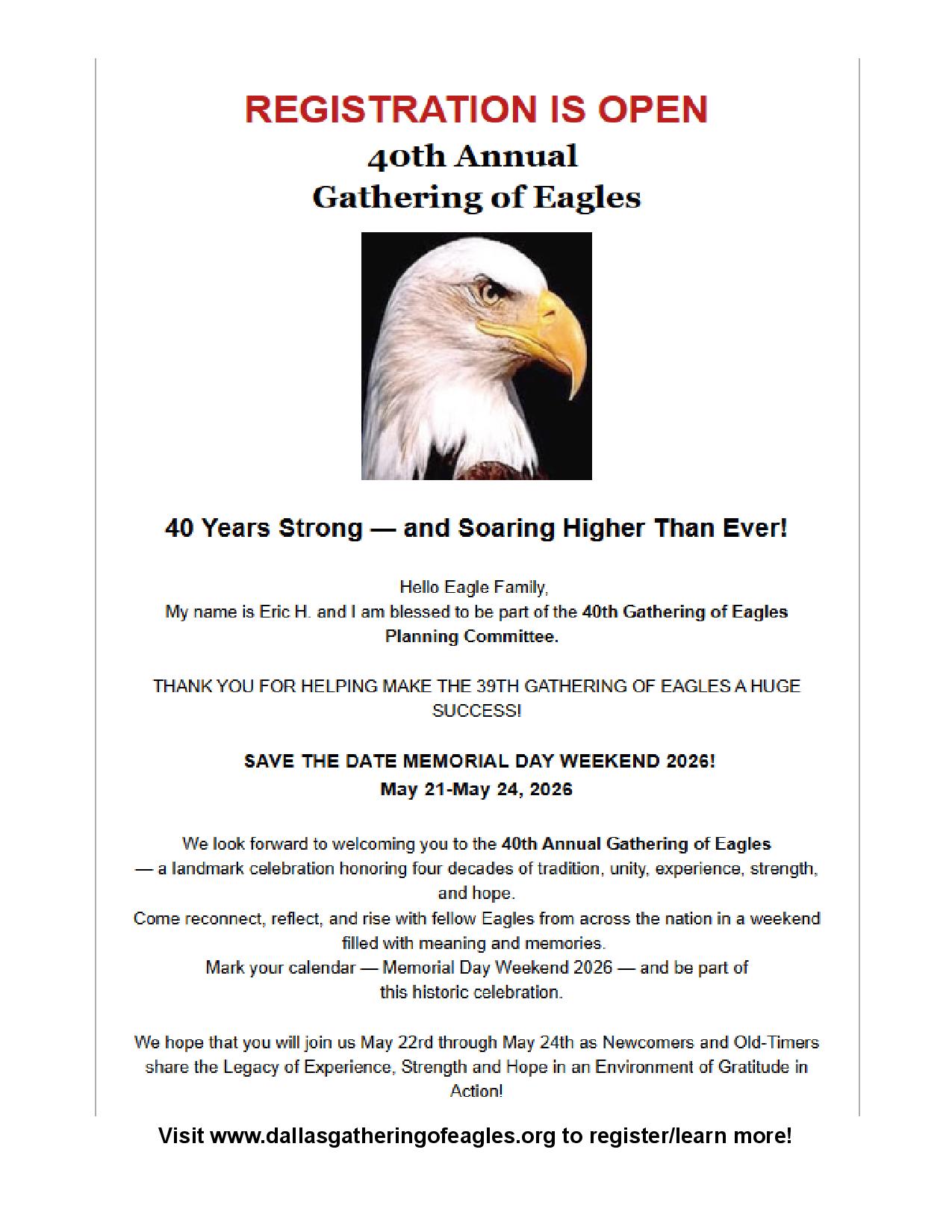 Visit www.dallasgatheringofeagles.org to register/learn more! click here to print/download